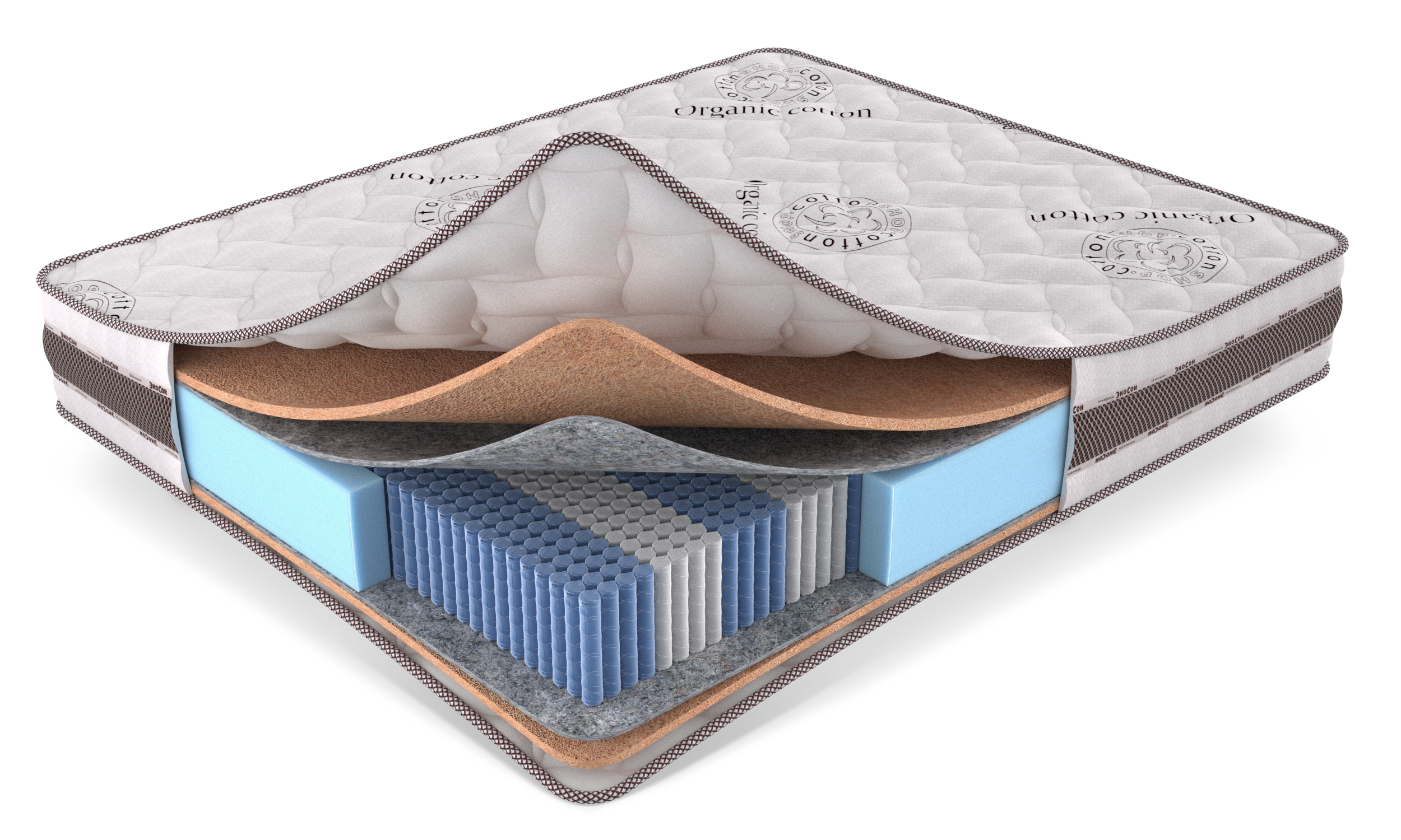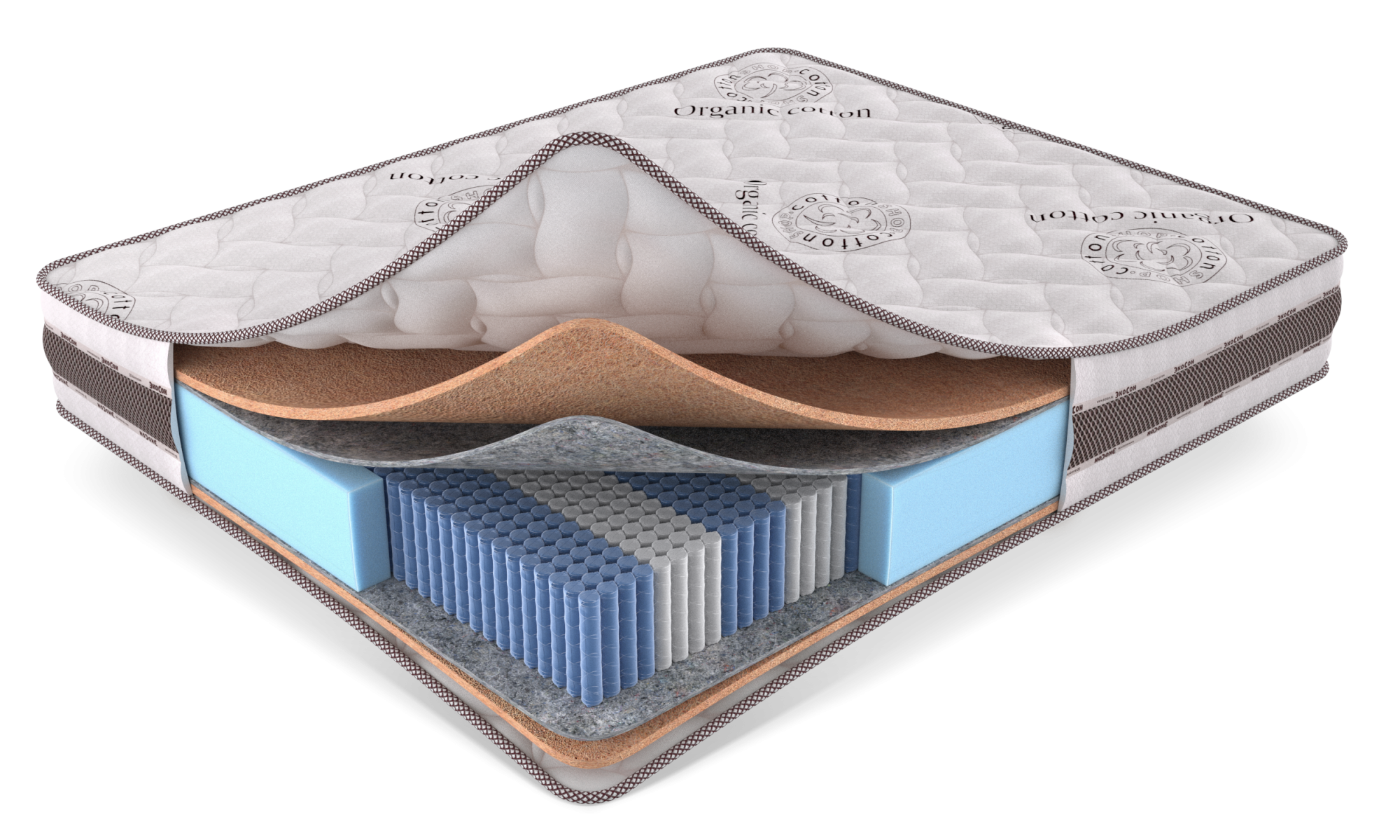 Верхний слой матраса выполнен из хлопкового трикотажа Cotton Organik, стёганного на гипоаллергенном волокне 300 г/м² и EcoFoam (10 мм), что делает поверхность мягкой, дышащей и гигиеничной. Система 3D-аэрации обеспечивает свободную циркуляцию воздуха и продлевает срок службы матраса.