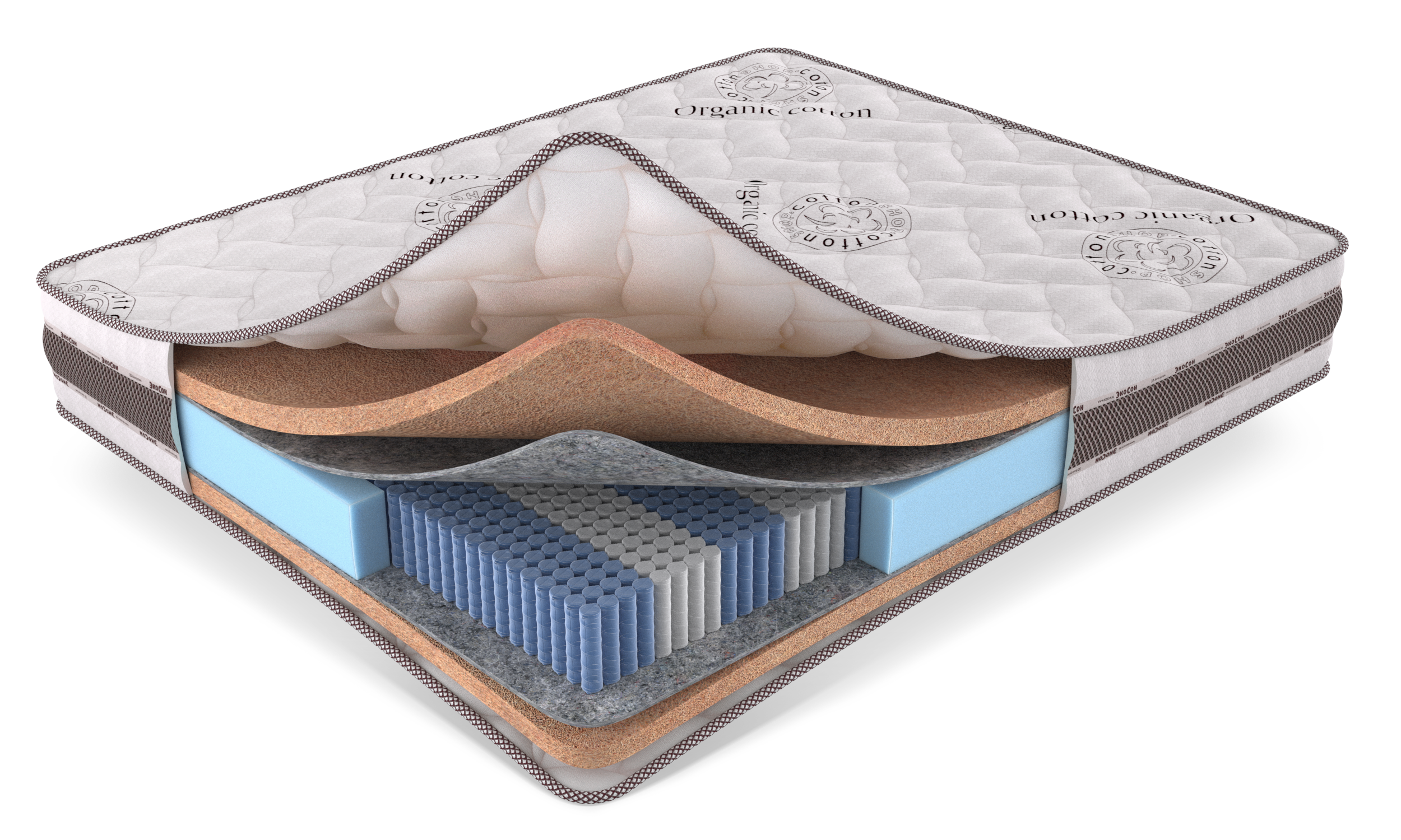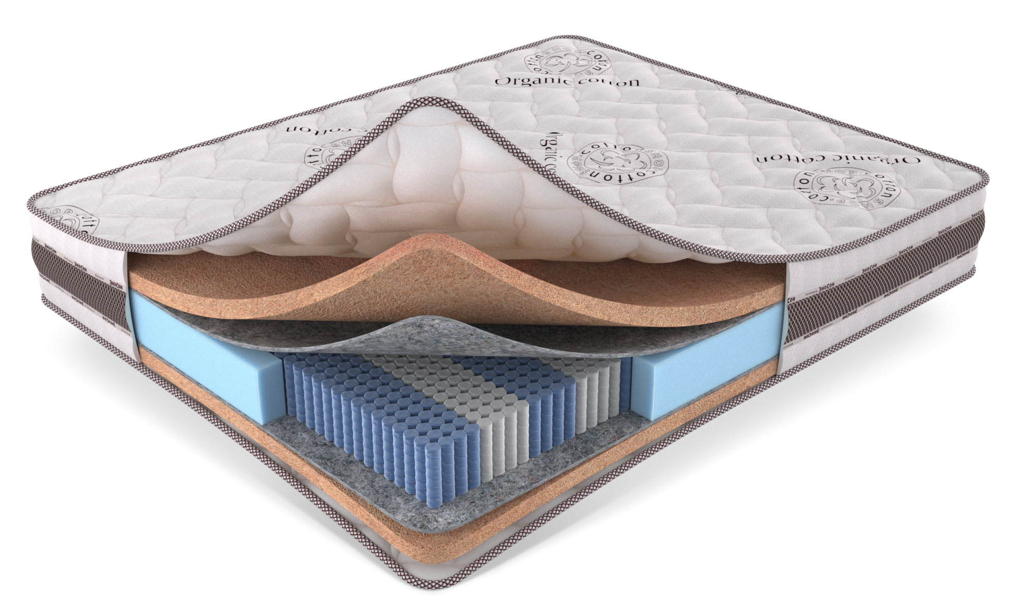 С обеих сторон пружинного блока расположены слои кокосового волокна толщиной по 30 мм. Натуральный кокос придаёт матрасу оптимальную жёсткость, повышает его износостойкость и способствует правильному положению спины во сне.
