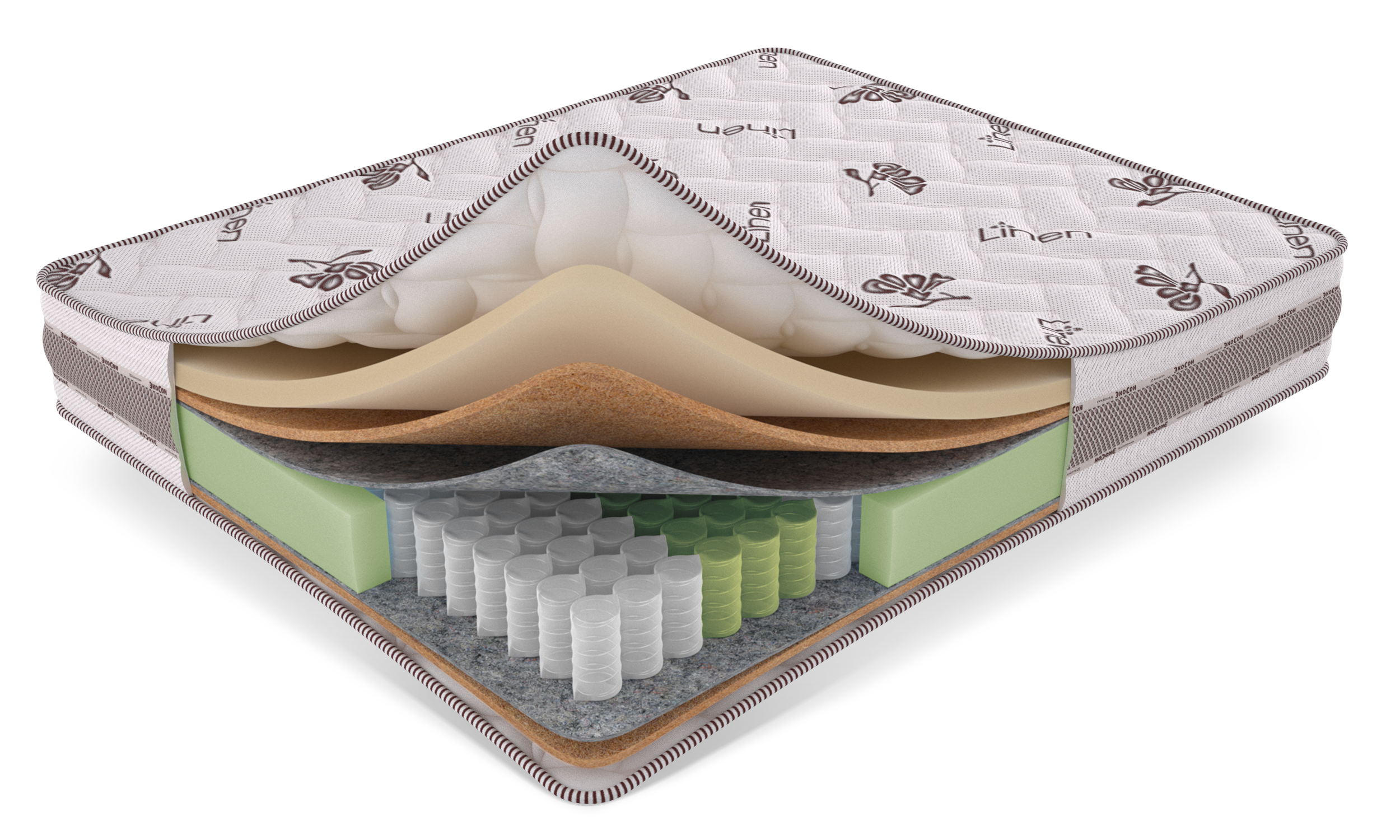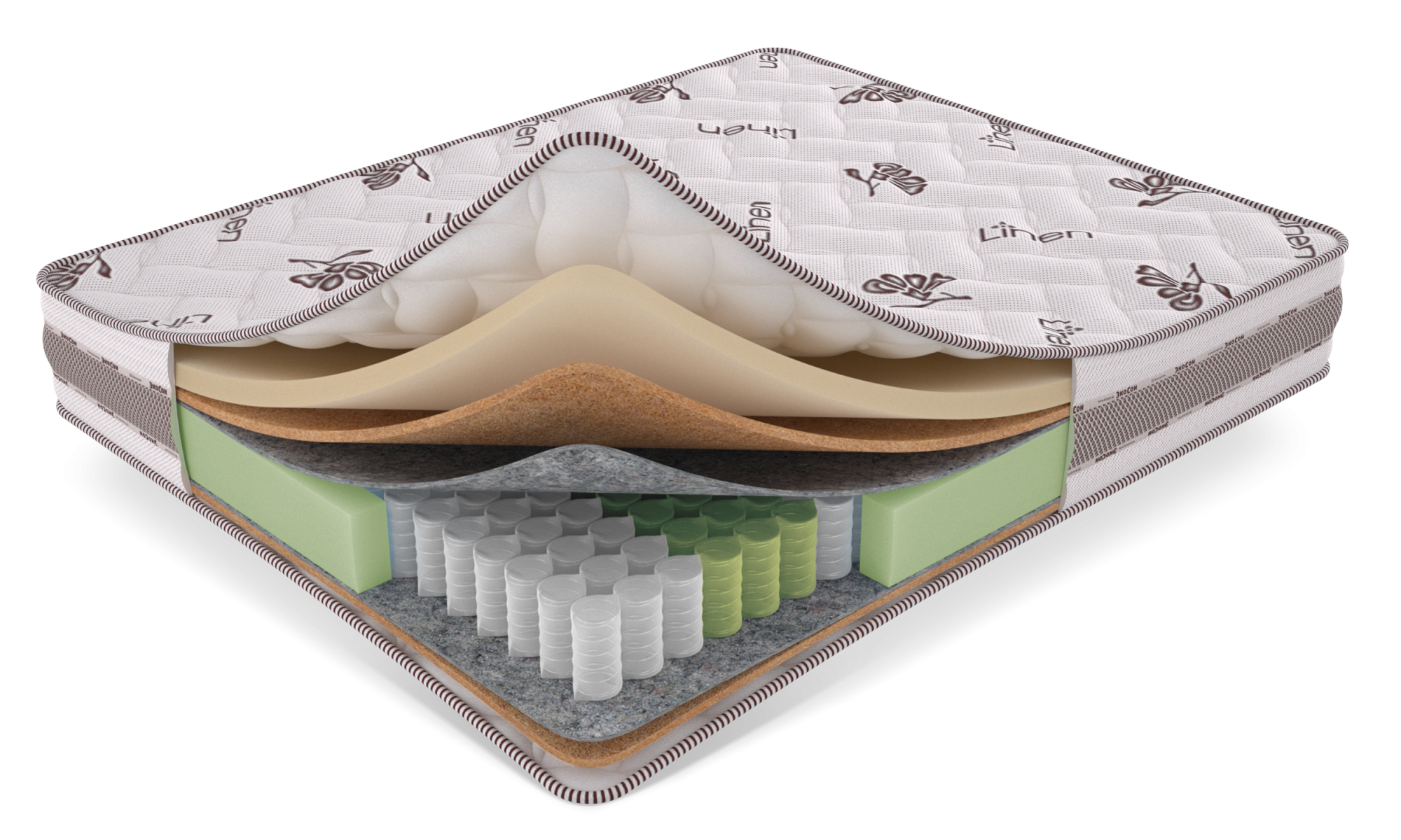 Чехол из натурального льняного трикотажа Linen, стеганный на Hollcon 300 и EcoFoam 10 мм, обеспечивает мягкость, гигиеничность и приятный тактильный контакт.